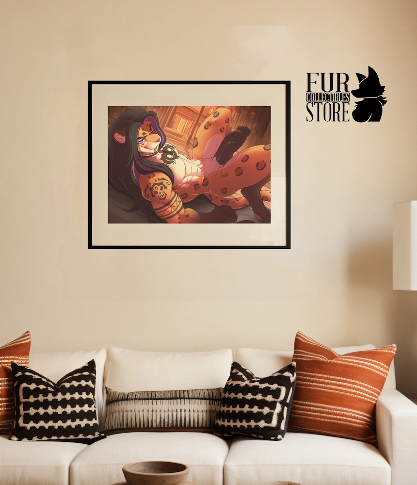 Bring Dia de los Muertos to your walls with the Yaotil poster, crafted by TattooRexy. This A3 (29.7×42 cm) artwork captures Yaotil, a proud male jaguar steeped in ancient Aztec magic, lounging on urban cobblestone streets. His Mexican skull tattoos and purple-streaked dark hair glow under festive light, available in an SFW variant with red boxers or an NSFW nude version for bold impact.
